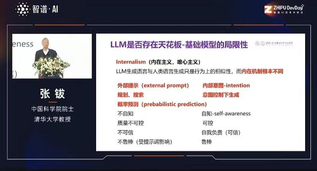 人工智能有助于推动经济增长,建筑、维护、安装等行业难以被自动化和智能化,但行政管理等白领工作或被AI替代。AI可提高大多数人类工作的质量和效率,但被AI完全替代的工作仍是少数。之所以AI还不能替代大多数工作,是因为大模型还存在难以逾越的天花板。张钹表示,大模型的所有工作都是外部提示而非主动,并且在外部提示的情况下利用概率预测完成任务,而人类的工作依靠内部意图驱动。大语言模型生成语言与人类语言生成只是行为上的相似性,而内在机制根本不同,大语言模型存在不自知、质量不可控、不可信、鲁棒等天花板,给出不同的提示词,大模型会输出不同的回答。大模型也会产生幻觉,“不管模型多么大,幻觉这个缺点一直存在。”