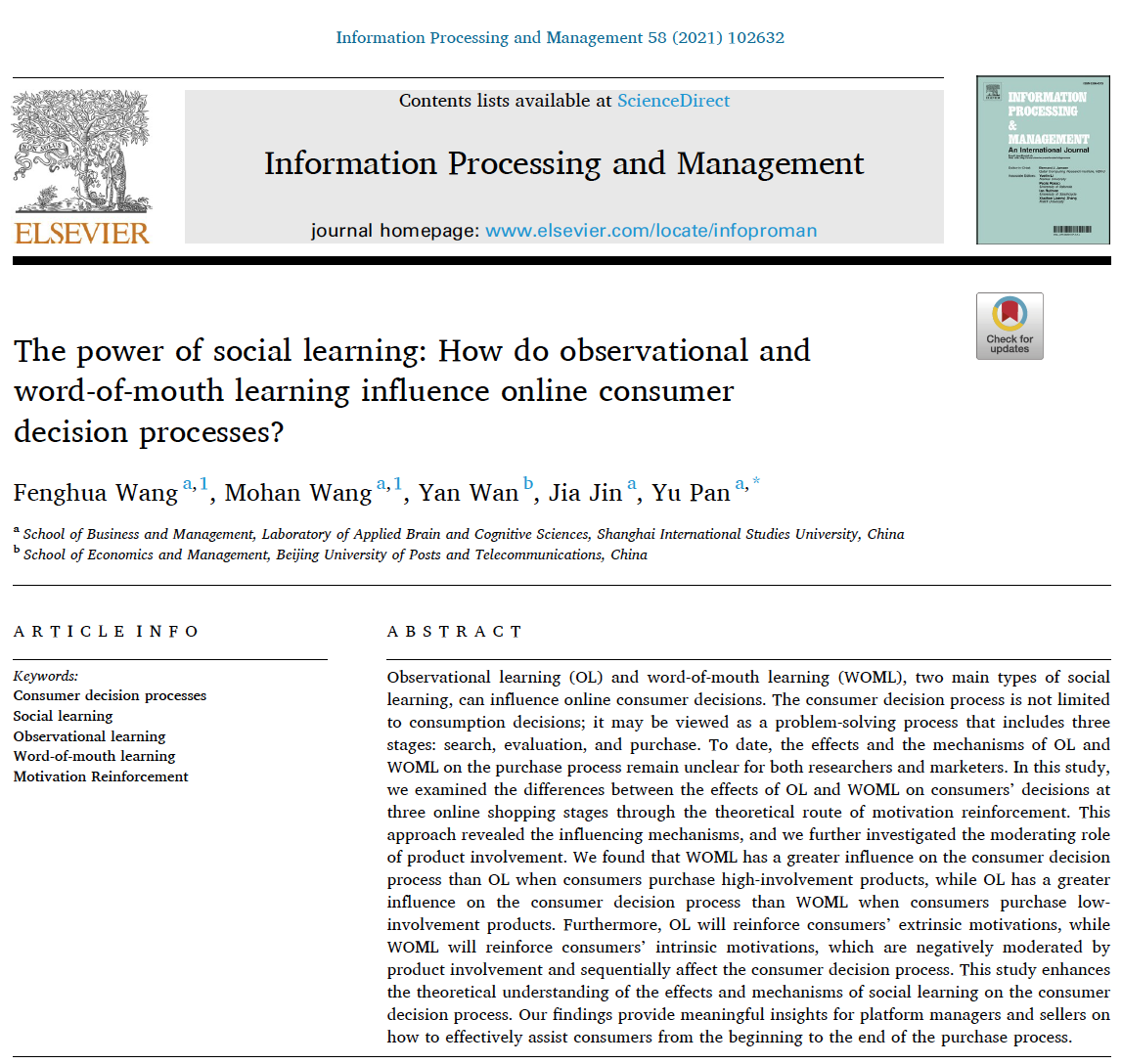 Fenghua Wang1, Mohan Wang1, Yan Wan, Jia Jin, Yu Pan*. The power of social learning: How do observational and word-of-mouth learning influence online consumer decision processes? Information Processing and Management, 2021, 58(5), e102632. doi: 10.1016/j.ipm.2021.102632.