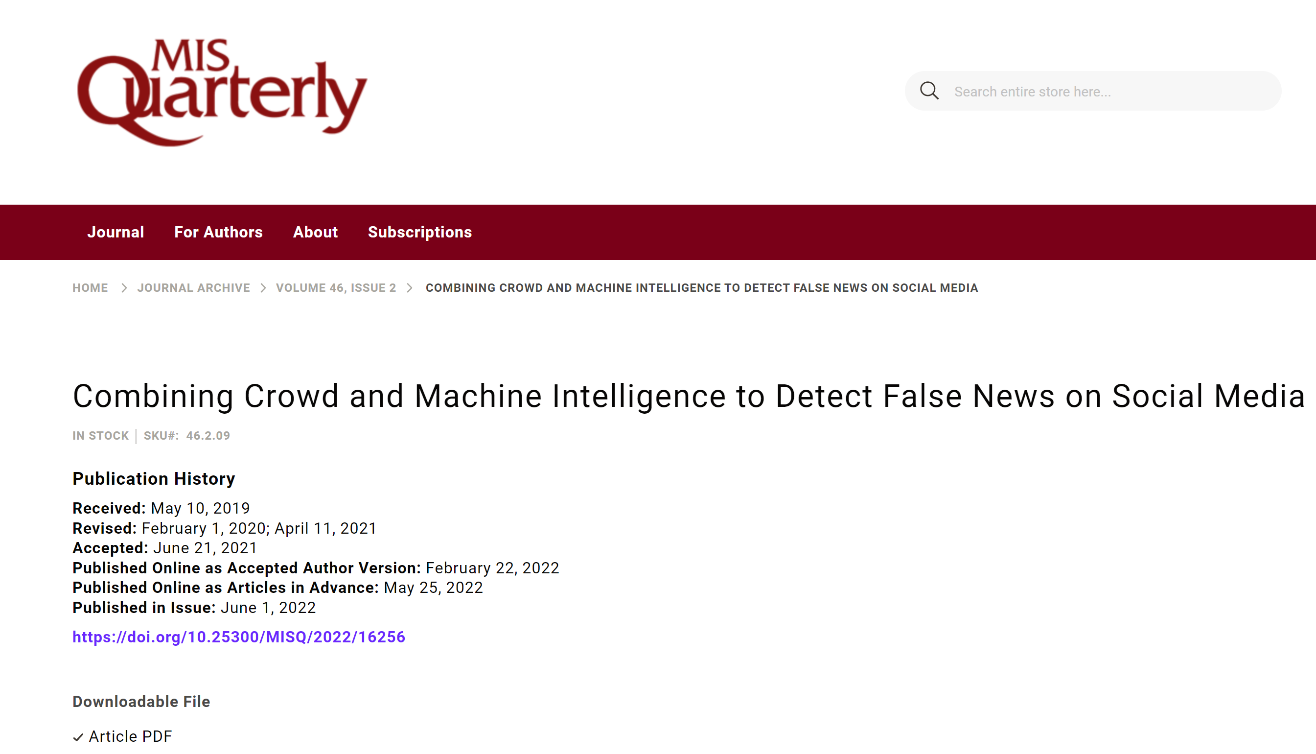 2022年6月,上外管院信息管理与决策科学系张明月副教授,以共同通讯作者身份在信息系统领域顶级期刊MIS Quarterly发表论文“Combining Crowd and Machine Intelligence to Detect False News on Social Media”(Volume 46, Issue 2, 2022, 977-1008, https://doi.org/10.25300/MISQ/2022/16256)。