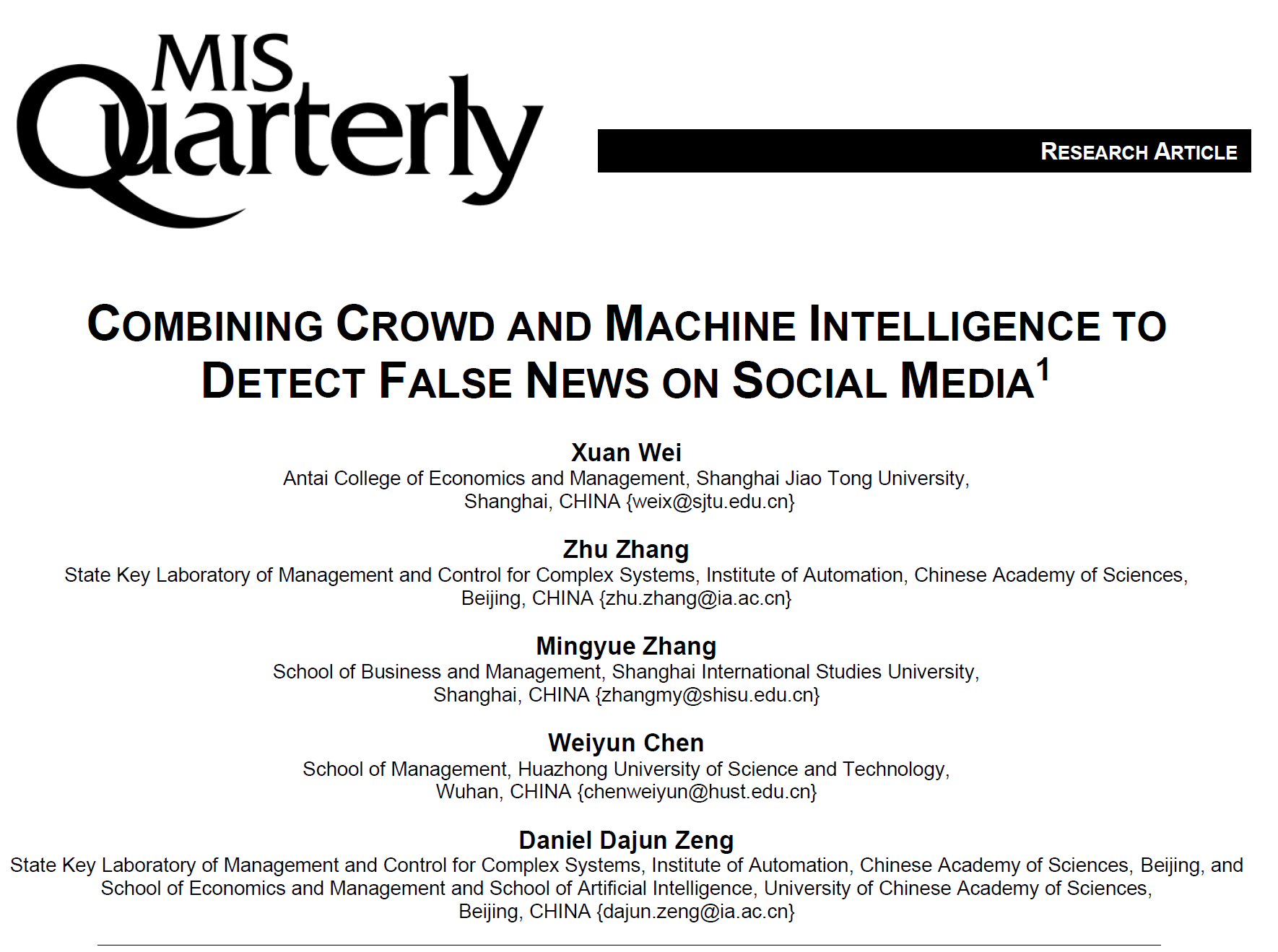 Wei, X., Zhang, Z.*, Zhang, M.*, Chen, W., & Zeng, D. D. (2022). Combining Crowd and Machine Intelligence to Detect False News on Social Media. MIS Quarterly, 46(2), 977-1008.
