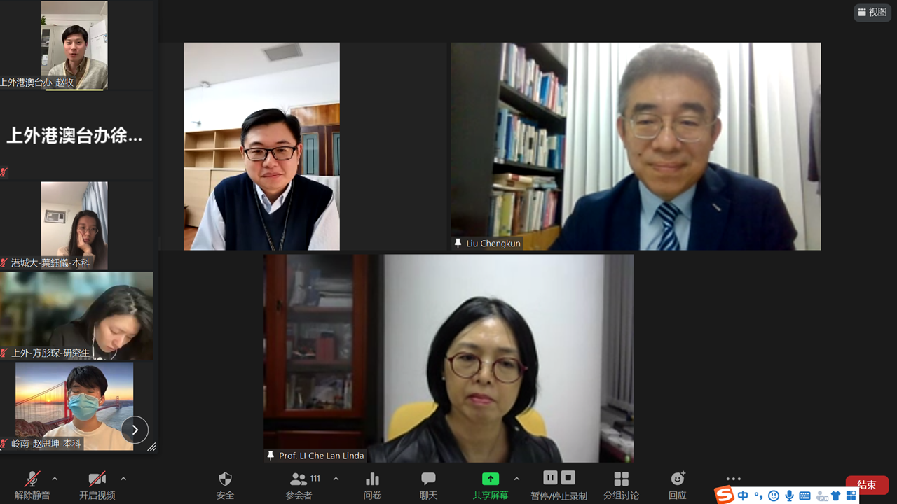 2021年10月18日至22日,开云电竞注册流程与港澳高校合作举办为期五天的“沪港澳与‘一带一路’专题研修班”在线上成功进行,来自香港大学、香港城市大学、香港岭南大学、澳门科技大学以及本校港澳台籍的120余名学生齐聚云端,在线聆听知名专家学者讲座,共同学习交流。