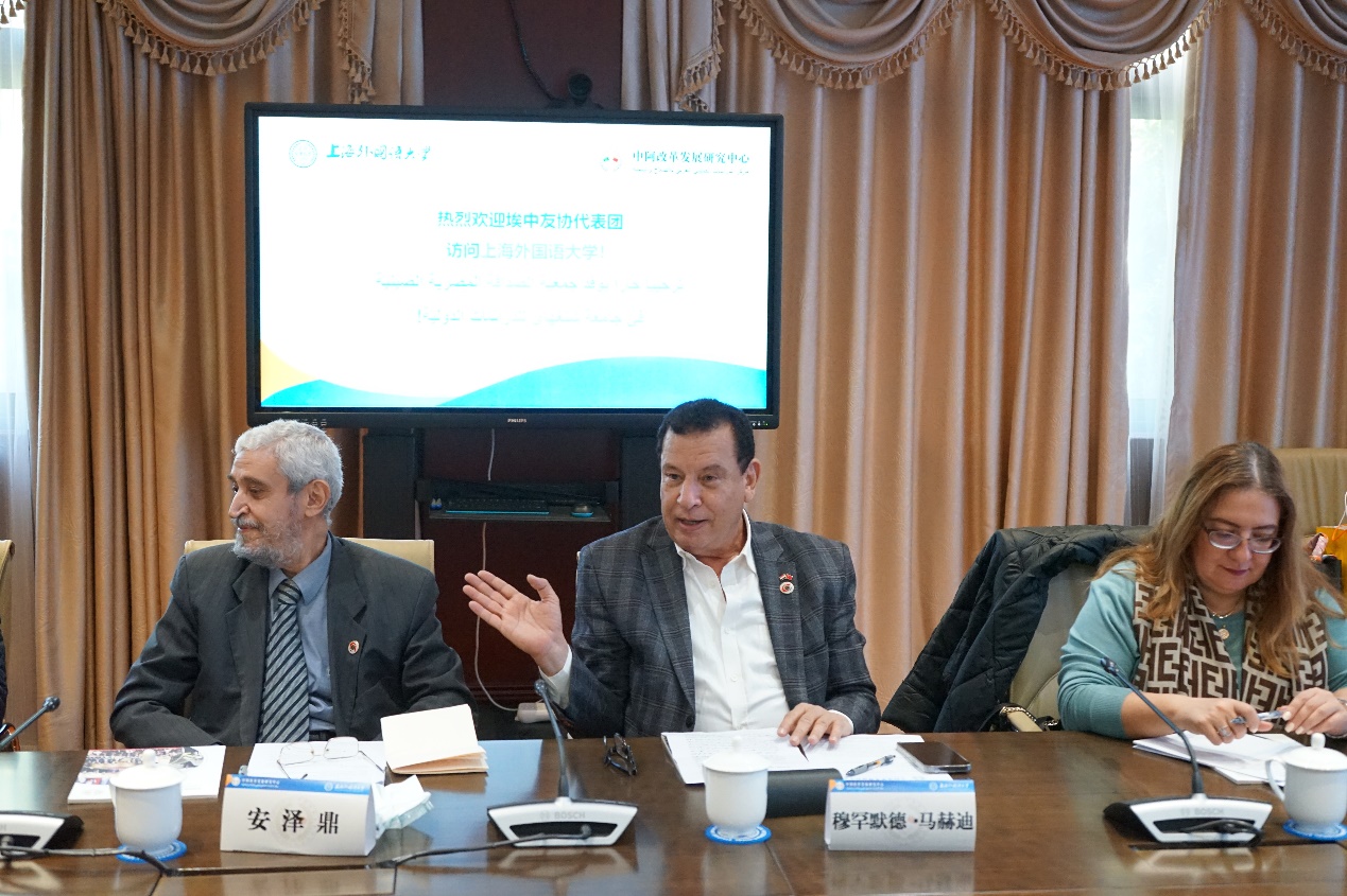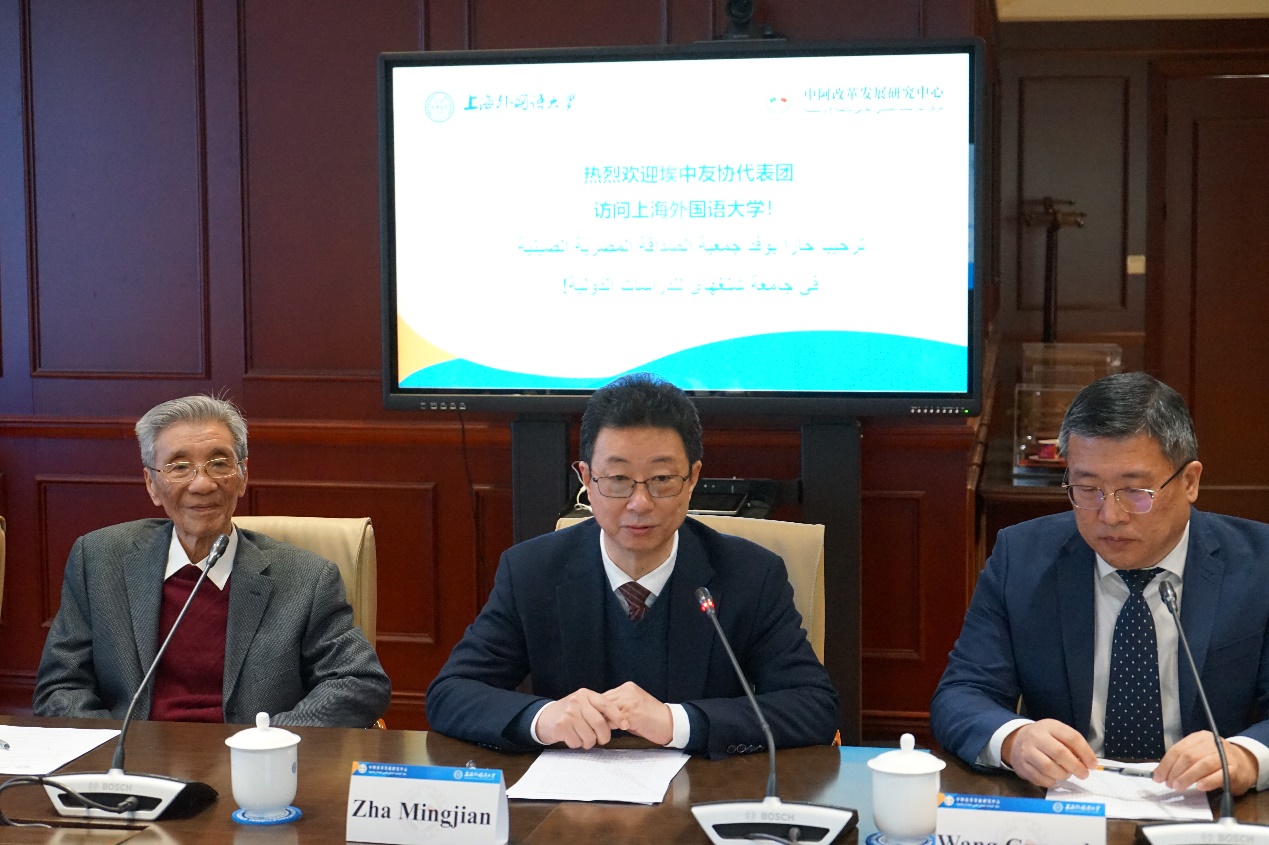 查明建欢迎埃中友协一行来访,介绍我校学科建设、人才培养及国际合作方面的最新发展,特别是中阿改革发展研究中心的对阿、对埃合作交流。查明建表示,中埃都是文明古国,两国应从古老文明中汲取智慧,为应对人类面临的共同挑战贡献力量,上外、中阿中心对埃高校合作有历史传统,希望埃中友协为上外、中阿中心与埃及的合作牵线搭桥,达成更多务实成果。