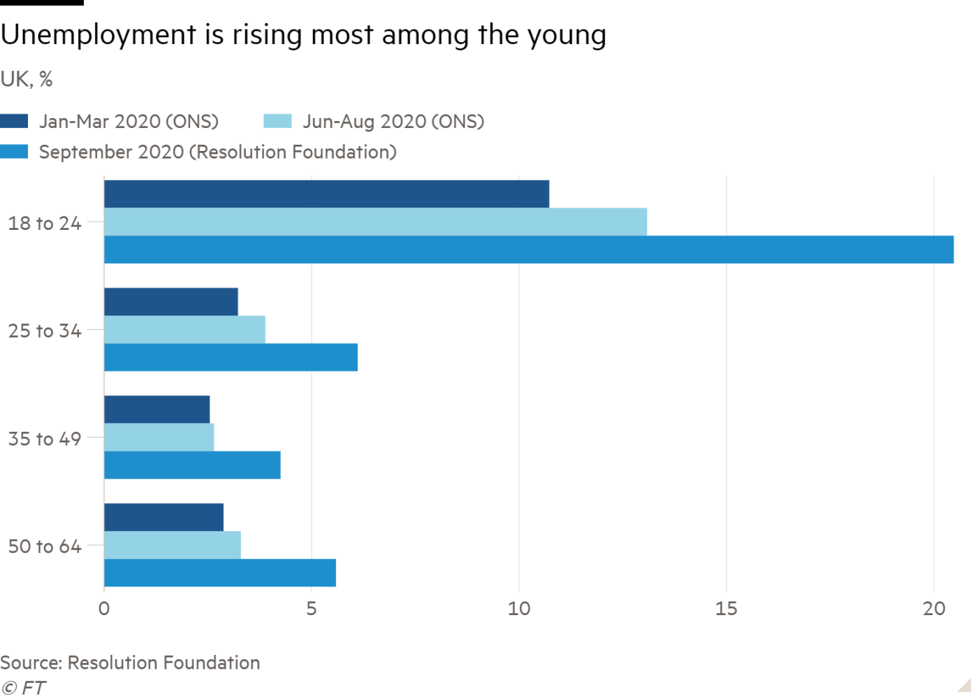 另外,随着9月、10月份“强制休假”计划资金支持力度减弱,企业承担了更高的开销,许多企业因无力承担用工成本开始裁员,年轻人在计划实施后期面临失业风险剧增。小型企业联合会的克雷格·博蒙特告诉英国广播公司(BBC)的《今日计划》,“全国有100万小型企业使用了休假计划,其中有23%的小型企业正考虑在未来三个月内减少员工数量。这种情况非常严重,经济的很大一部分将受到影响。在私营部门工作的人中有60%是为小型企业工作的,因此,若对这种情况置之不理,将会出现大规模失业现象。”