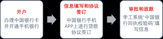 通过学工系统“中国银行回执校验码填写”应用填写“入学校验码“等信息,学校资助中心将“入学校验码”填入系统后,提交银行后台审核,银行审批通过后放款。