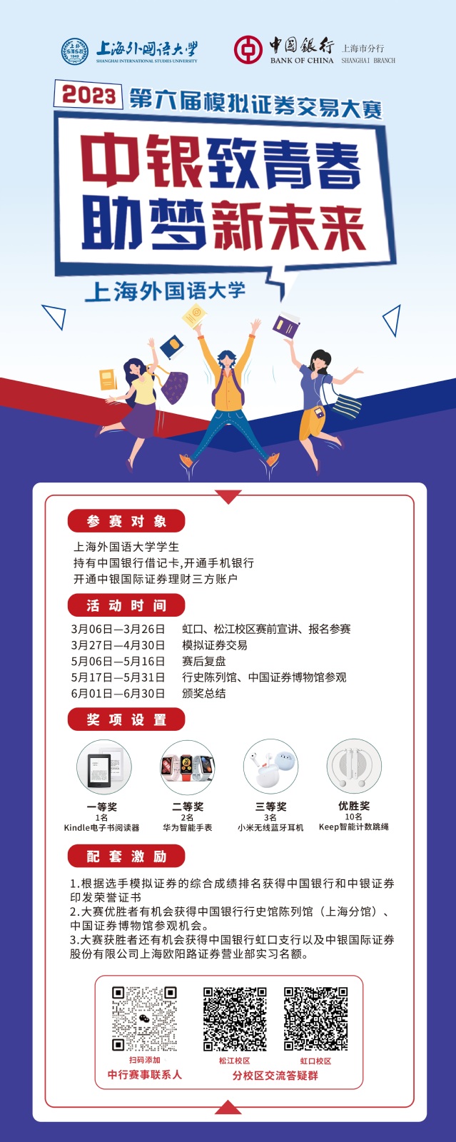 为进一步丰富校园文化,搭建第二课堂实践平台,展现学子风采,中国银行虹口支行、中银证券上海欧阳路证券营业部携手开云电竞注册流程共同举办“中银致青春、助梦新未来”模拟证券交易大赛。