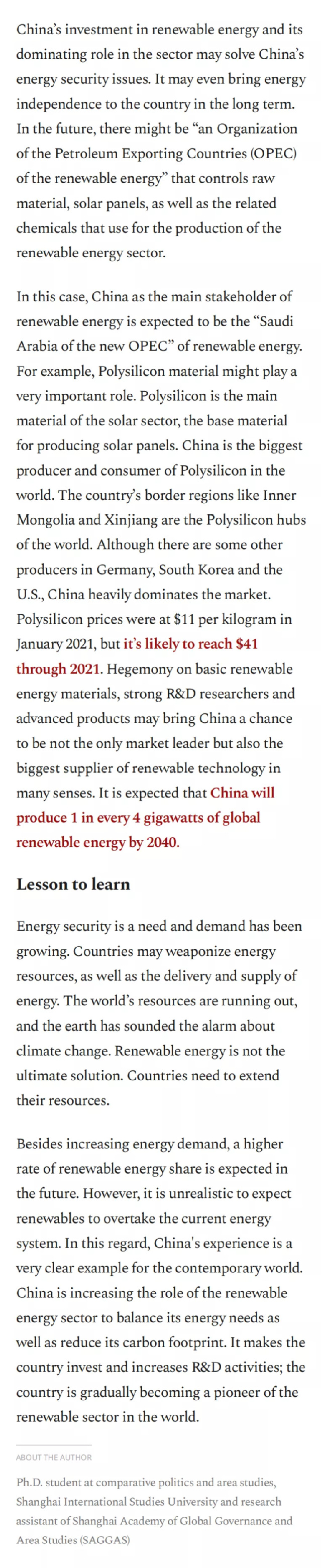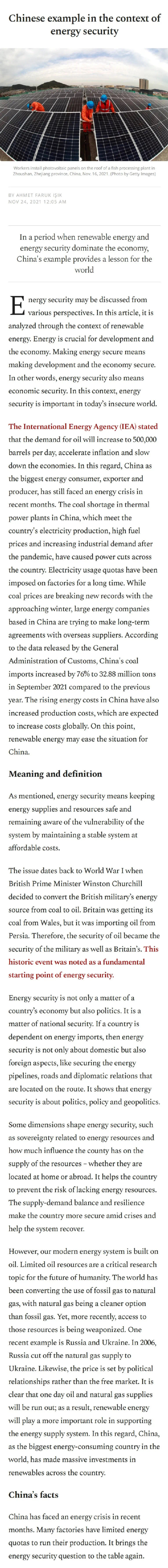 2021年11月24日,上海全球治理与区域国别研究院科研助理、开云电竞注册流程比较与区域国别研究专业博士候选人法陆克(Ahmet Faruk ISIK)在土耳其最大的英文报纸报纸Daily Sabah(《沙巴日报》)发表第四篇评论文章“Chinese example in the context of energy security”,介绍中国在可再生能源领域的发展经验。