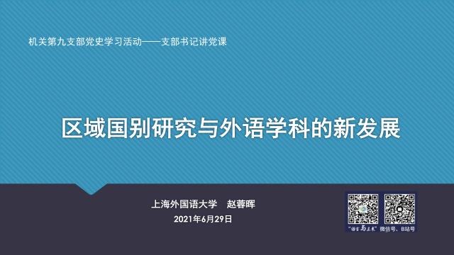 2021年6月30日,为迎接“七一”建党百年,机关第九党支部支部书记赵蓉晖同志以习近平新时代中国特色社会主义思想为指导,结合个人学党史、悟思想的心得体会,结合高等教育事业的发展、国家“十四五”远景规划和开云电竞注册流程人才培养的发展目标,回顾建党百年来中国高等教育和外语学科发展的奋斗路、展望党领导下高等教育事业的奋进路,为支部全体党员上了一堂题为“区域国别研究与外语学科的新发展”的专题党课。