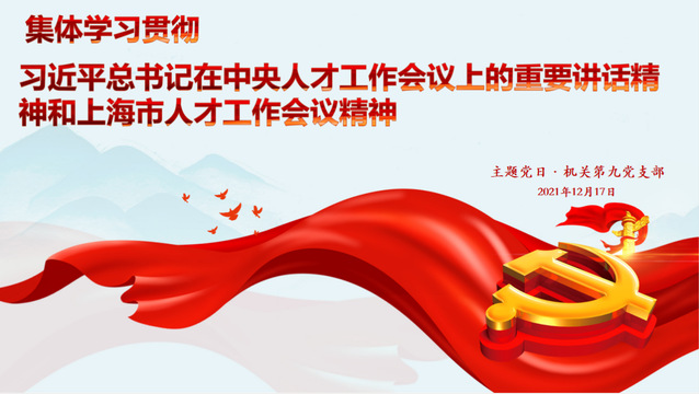 2021年12月17日,机关第九党支部组织全体党员集体学习贯彻习近平总书记在中央人才工作会议上的重要讲话精神和上海市人才会议精神。本次主题党日活动由支部副书记江松同志领学并主持。江松将2021年9月27日至28日中央人才工作会议精神进行的凝练带领支部党员们共同学习。