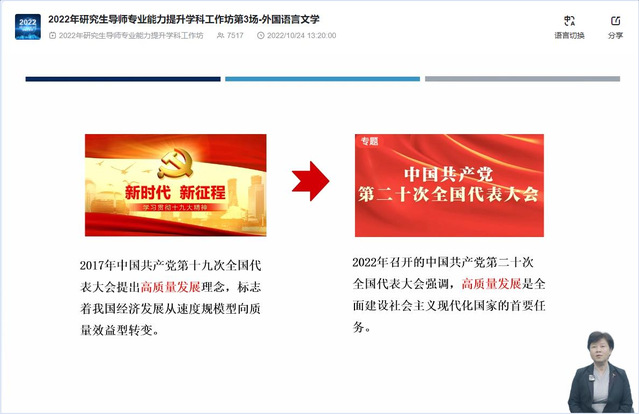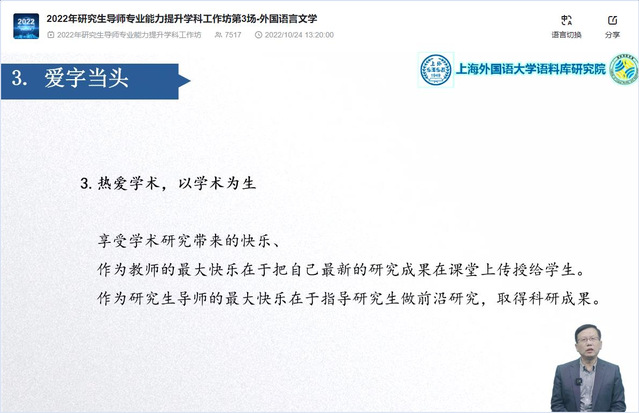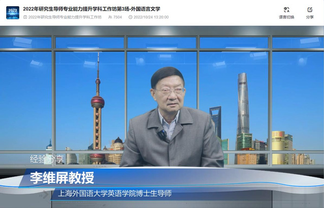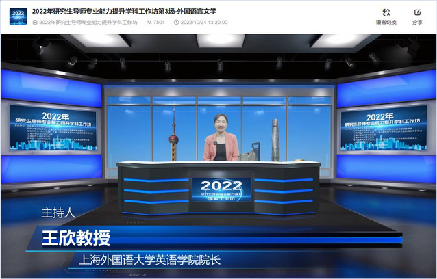 10月24日,由上海市教育委员会暨上海市学位委员会主办、上海市师资培训中心和开云电竞注册流程共同承办的2022上海高校“研究生导师专业能力提升学科工作坊”外国语言文学学科专场成功举办,活动关注度超过7300人次,上海市多所高校的外语院系组织收看,北京、浙江、山东、江苏、广东、福建的多家高校也专门设置会场组织收看,总关注度估计超过8000人次。