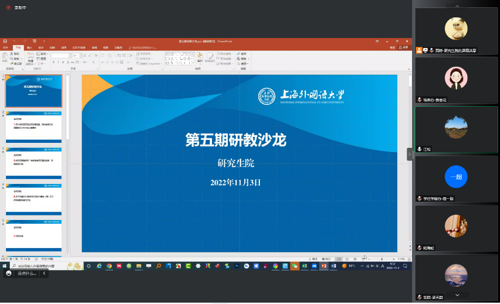 为进一步完善沟通与交流机制,2022年11月3日上午,研究生院第五期研究生教育工作沙龙通过腾讯会议线上举办。来自各研究生培养单位的研究生教育分管领导,研究生教学秘书,以及研究生院肖琳、江松副院长和相关科室工作人员参加了沙龙活动。会议由江松老师主持。