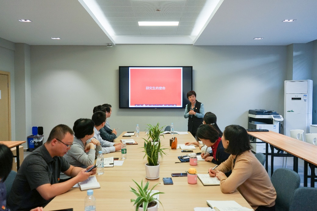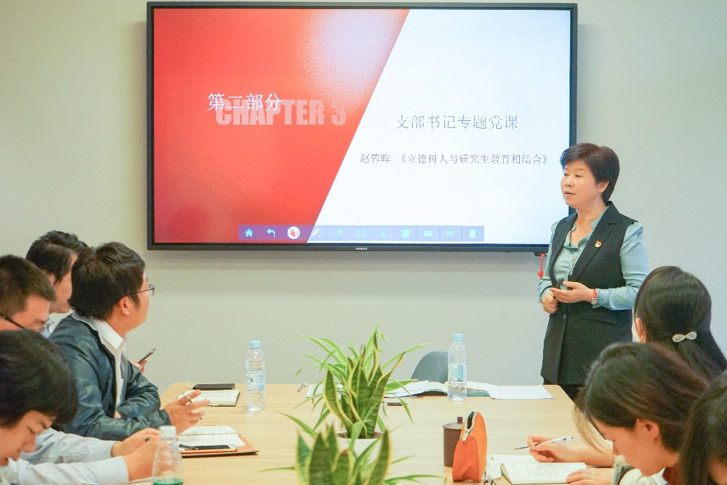 赵蓉晖对照习近平总书记对高等教育发展的工作要求,结合研究生院实际情况,做了题为“以立德树人为目标——上外研究生教育管理的问题与反思”的专题党课。她强调,这次学习教育活动一定要结合本职工作开展深入的思考,让党课有内涵、有抓手、有反思、有落实、有成效。研究生院全体党员要基于“立德树人”为教育核心目标的思想共识探讨如何对标国家大政方针、对标学校战略规划开展研究生教育管理工作。赵蓉晖以《深入学习习近平关于教育的重要论述》一书第二章“坚持把立德树人作为教育的根本任务”为核心文本,结合研究生教育的各个侧面,首先讨论了“研究生教育的目标与使命”“什么是学术创新”“如何创新”等问题。接着,她结合习近平总书记关于立德树人的论述,从理想信念、素质教育及其内涵等方面进行了解读,并结合我校研究生教育的实际情况与大家展开交流。
