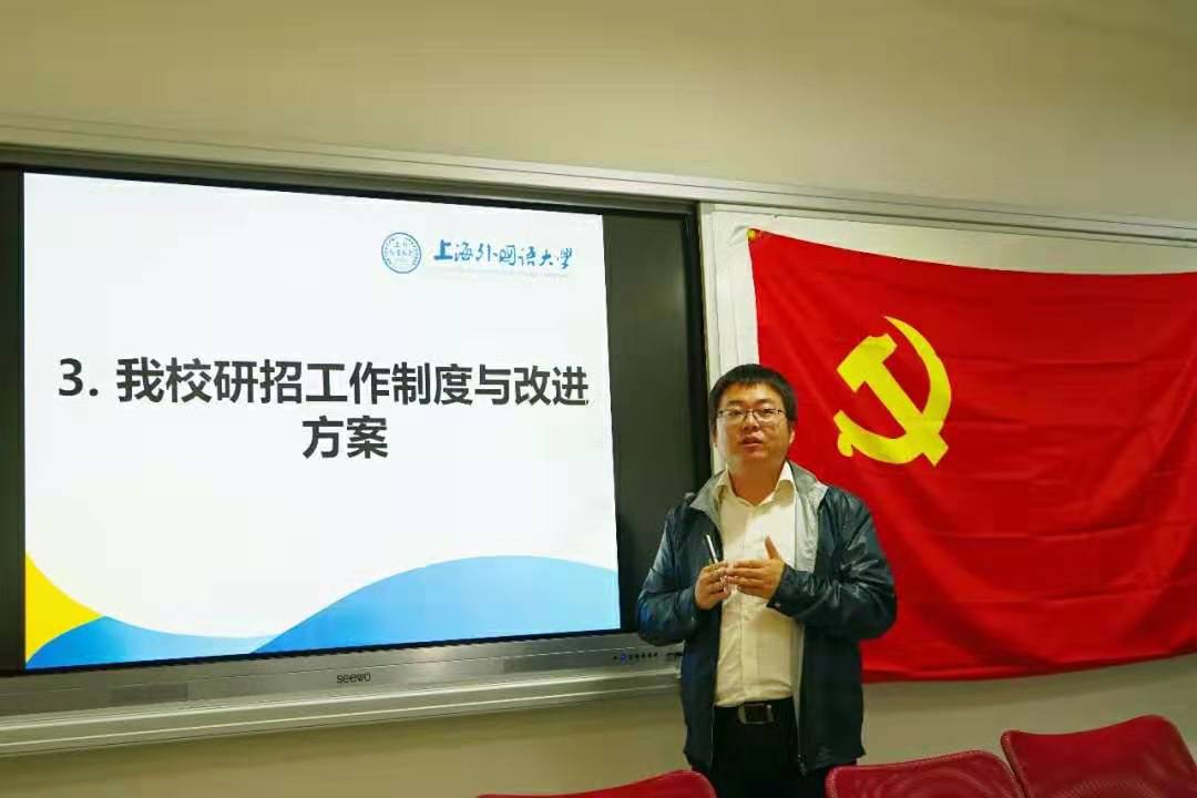 机关第九支部党员,研究生院招生综合办董照磊同志,结合教育部最新工作文件精神,就我校2018、2019年研招工作总结内容为支部党员分享我校研招工作制度与改进方案。董照磊用近年来全国高校招生工作情况为案例,结合我校研招实际情况,介绍了上外研招工作情况和发展愿景。