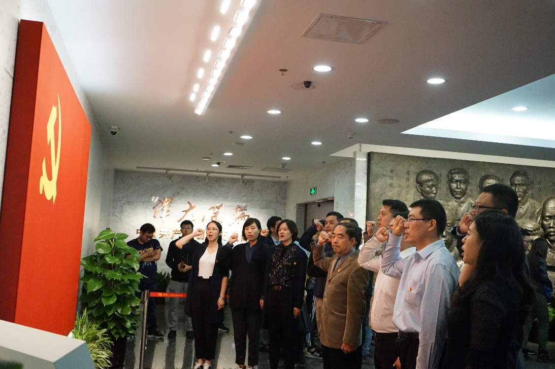 在一大会址的门厅前,机关九支部党龄最高的老党员冯庆华教授带领全体党员举起右拳对着党旗重温入党誓词,牢记党员的使命与担当。正如习近平总书记所说,入党誓词字数不多,记住并不难,难的是终身坚守。每个党员要牢记入党誓词,经常加以对照,坚定不移,终生不渝。