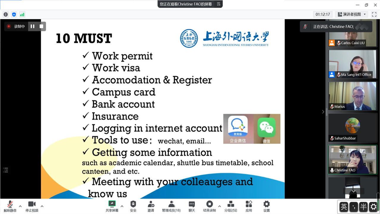 9月8日下午,对外合作交流处在线举行2022年度新聘外国专家欢迎会和入职培训,来自10个国家的10名新聘外国专家和多名老外教参加会议,会议由麻桑副处长主持。