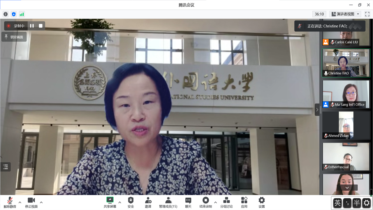 对外合作交流处处长张红玲教授代表学校欢迎新聘外国专家。她介绍了上外的历史沿革和近年来在区域国别研究、脑与认知科学等前沿交叉学科的发展成就,感谢所有外国专家对学校人才培养和学科建设做出的重要贡献。张红玲为新聘外国专家提出了三点建议:一是要遵守防疫规定,保证自己的身心健康;二是走出自己的舒适圈,多与学校师生沟通交流,尽快融入上外大家庭,同时,还要更多了解上海,理解中国,积极讲述外国专家眼中的中国故事;三是发挥自身的文化背景优势,在日常教学科研工作之余,向上外师生介绍自己的国家和文化,为上外的国别区域研究做贡献。最后,张红玲向外国专家们送上了教师节和中秋节的慰问,祝愿他们在中国、在上海、在上外工作生活愉快。