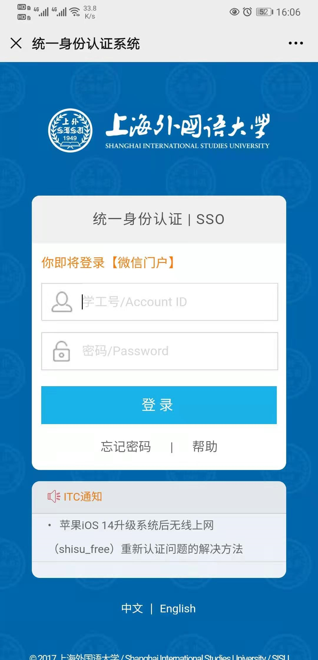 Solution 2: The current account ID has completed the identity binding operation with the current cell phone number, but recently unfollowed WeCom, please click this link http://portal.shisu.edu.cn/node/25083, login in to the chart via the Unified Identity Authentication, and fill in the correct information, screenshot and description of the problem and submit, we will notify you by email after processing.