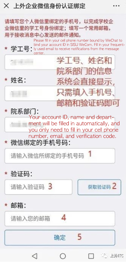 At this time, your account ID, name and department will be filled in automatically, while your cell phone number needs to be filled in by yourself. Please make sure that the cell phone number you fill in here must be the cell phone number bound by your WeChat.