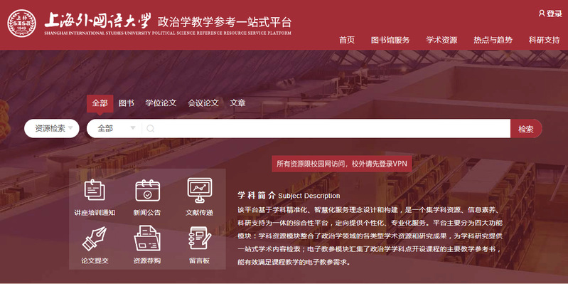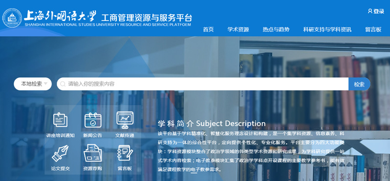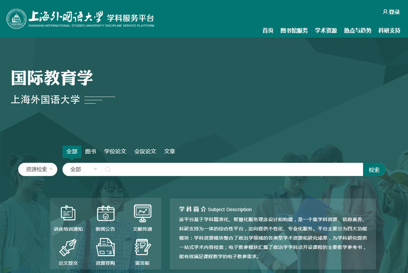 为加强对全校各学科教学和科研的支持,为不同学科师生提供更为专业化、针对性的信息资源服务,图书馆自2019年起陆续开展了学科资源服务平台建设的探索与尝试,目前共建成6个平台,覆盖政治学、工商管理、新闻传播、语言学、国际教育学、马克思主义哲学等学科。平台基于学科精准化、智慧化服务理念设计和构建,精心遴选了学科最常用、最权威的信息资源,并融合信息素养与科研支持于一体,可以有效支撑和服务于本学科领域的教学科研,定向提供个性化、专业化服务。这是图书馆支持学科发展,开展精细化、知识化学科服务的新探索,通过这样的学科平台模式可以起到服务全校更多更广学科专业的效果。
