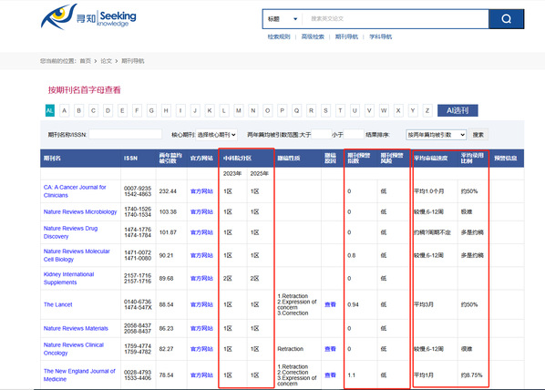 搜索框下进入期刊导航,可以通过期刊名称首字母或期刊名称检索期刊。我们还可以从这里快速进入个期刊的官方网站,了解各期刊的中科院分区,预警风险以及审稿速度和录用比例,为我们在论文中引用或未来投递论文提供数据参考。