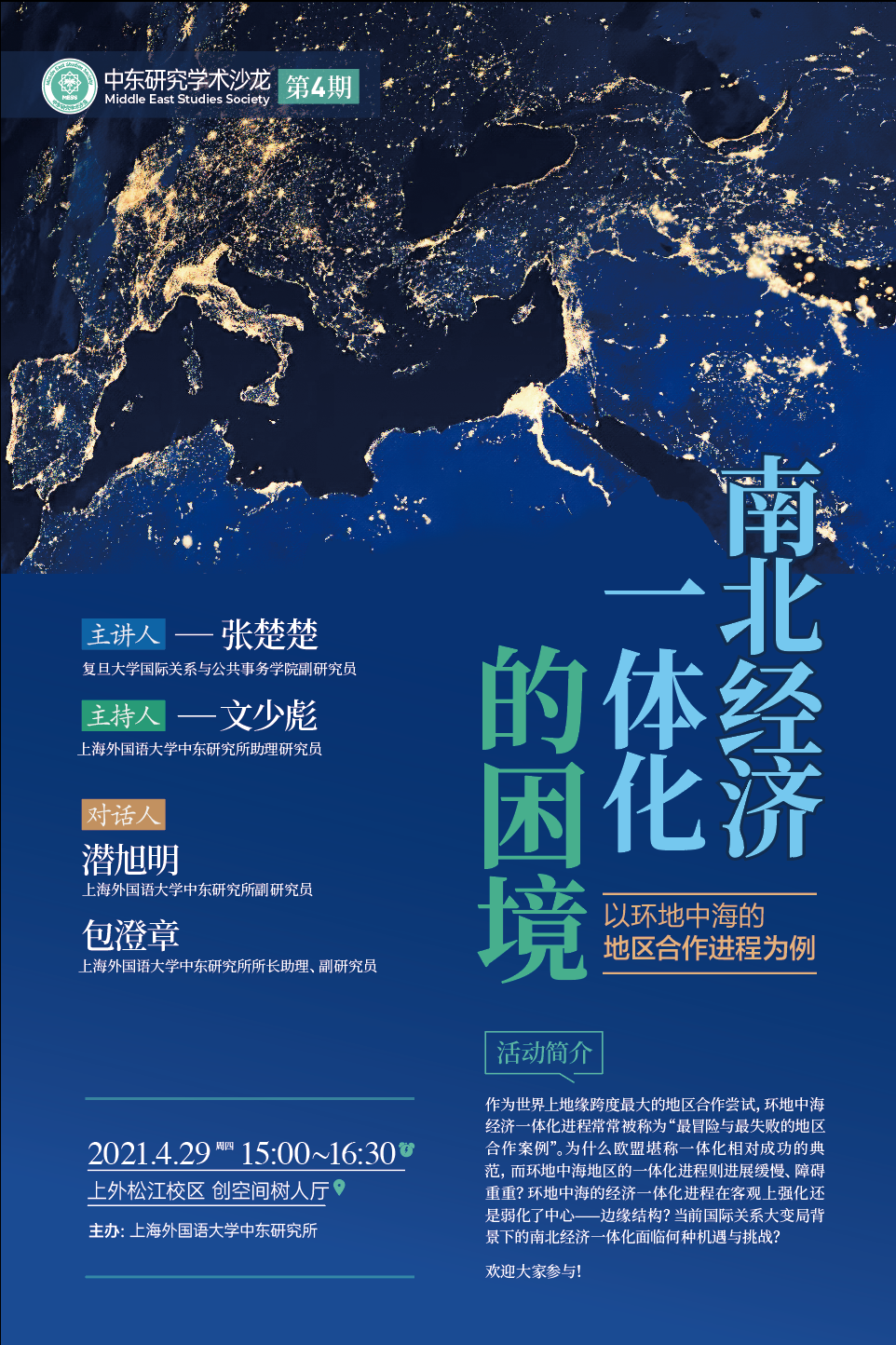 2021429日,由上外中东研究所主办的“中东研究学术沙龙”第4期在松江校区创空间树人厅举行。复旦大学国际关系与公共事务学院张楚楚副研究员作了题为“南北经济一体化的困境:以环地中海的地区合作进程为例”的学术报告。活动由中东研究所文少彪老师主持。中东研究所潜旭明、包澄章、文少彪等研究人员,以及全校多个院系的师生共20余人出席活动。
