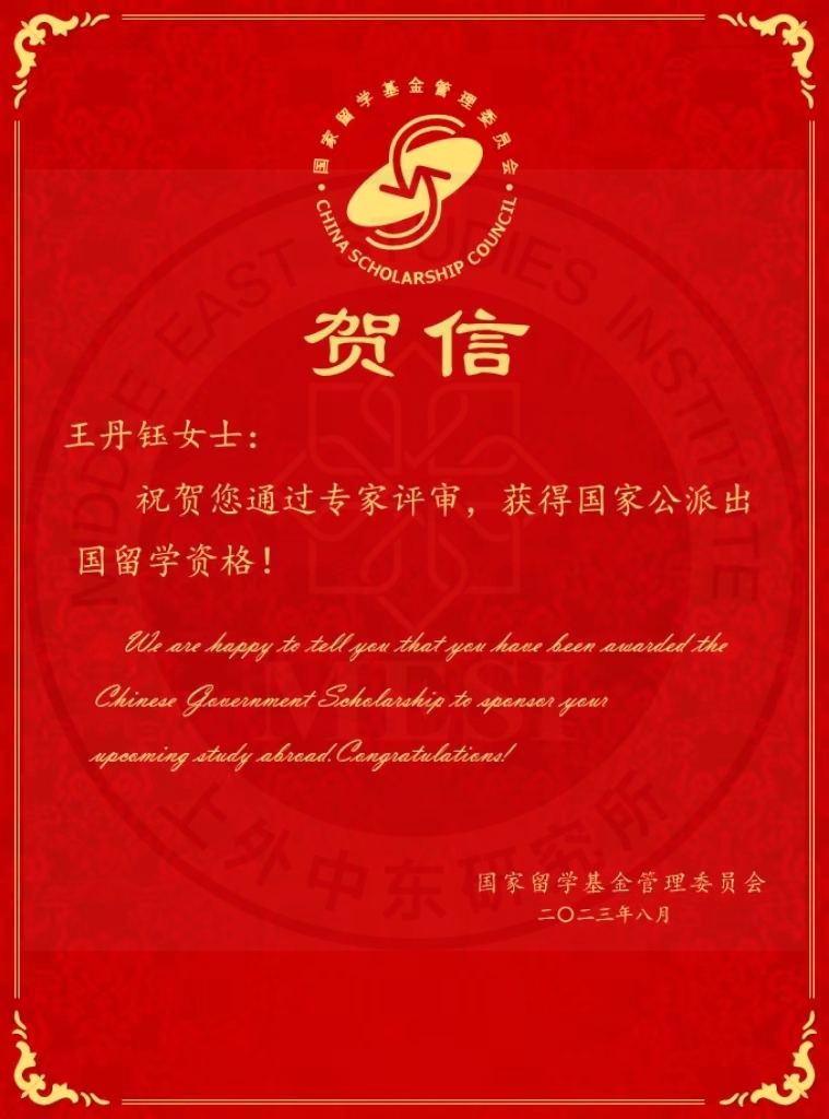 近日,上外中东研究所2021级博士研究生王丹钰通过专家评审,获得国家留学基金委“与有关国家互换奖学金计划(以色列互换奖学金)”项目的出国留学资格,将于2023年10月至2024年6月作为联合培养博士研究生前往以色列特拉维夫大学摩西·达扬中东非洲研究中心进行交流学习。