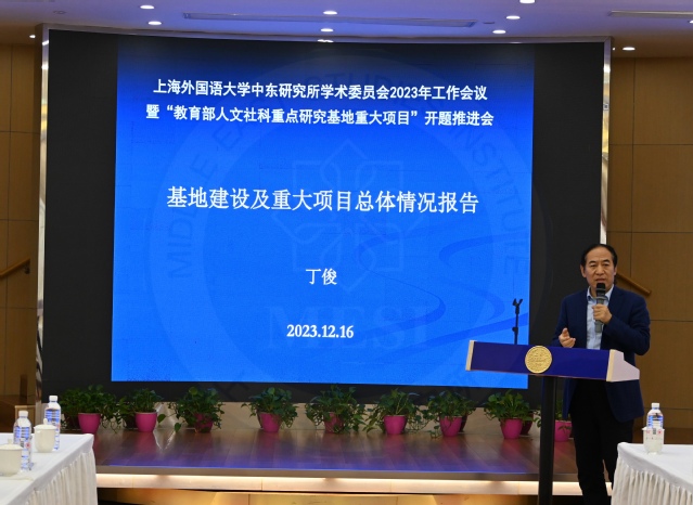 在会上,五位基地重大项目负责人上外中东研究所丁俊教授、上外中东研究所刘中民教授、兰州大学历史文化学院敏敬教授、复旦大学中东研究中心孙德刚研究员、上外中东研究所丁隆教授分别从各自主持项目的研究现状、研究意义、主要内容、总体框架、研究目标、研究思路、课题分工、总体进度、预期成果以及已经取得的阶段性成果等方面进行了介绍和汇报。上外中东研究所副所长余泳副研究员还介绍通报了上外中东研究所基地系列重大培育项目的总体情况,解析了设立培育项目对调动研究人员积极性、强化有组织科研、强化科研团队建设等具有的重要意义。
