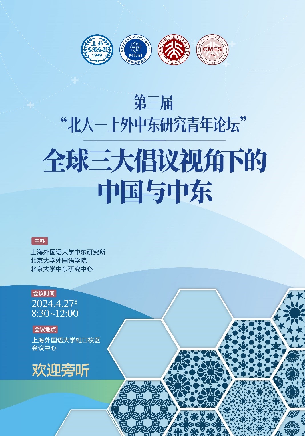 为进一步加强国内中东研究机构的学术交流与协同合作,推动中东研究的学术共同体建设,搭建青年学者交流平台,上海外国语大学中东研究所、北京大学外国语学院、北京大学中东研究中心将于2024年4月27日联合主办第三届“北大—上外中东研究青年论坛”,本届论坛主题为“全球三大倡议视角下的中国与中东”。