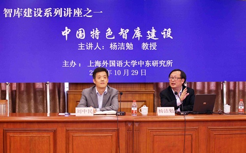 10月29日下午,应上外中东研究所的邀请,外交部外交政策咨询委员会委员、国家社科基金评审专家组成员、上海市国际关系学会会长、上海国际问题研究院前院长、我校特聘教授杨洁勉先生在虹口校区会议中心英伦厅为我校师生作题为“中国特色智库建设”的专题报告。此次报告会由上外中东所所长刘中民教授主持,中东所名誉所长朱威烈教授与全所师生以及来自其他院系的师生共30余人出席了此次报告会。