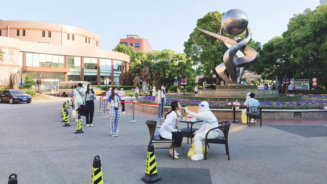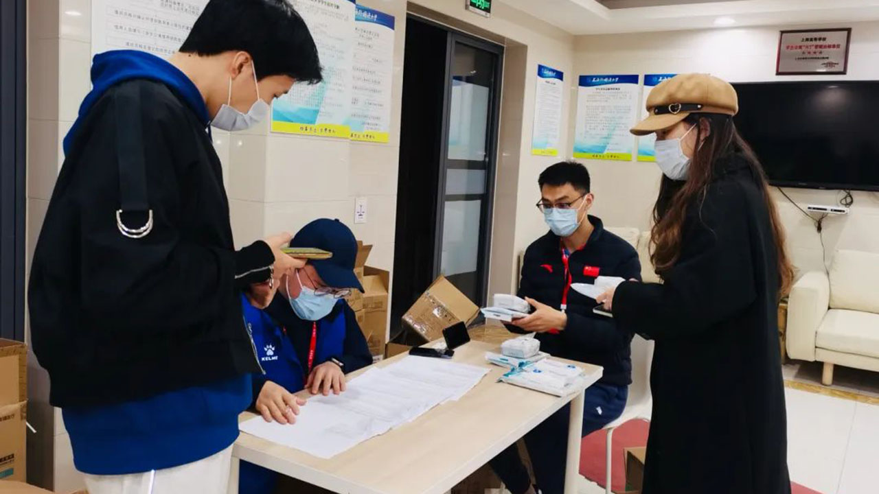 4月11日,虹口校区首次实现校内团队自主采样,每日“作业”时间短则三小时,长则六小时。为了方便师生就近采样,大白们每天在生活区和教学区间依次开展检测,在必要的时候进入楼宇各寝室门外逐个采样,医务人员、保卫同志和志愿者同学,常常一采就是半天,没有人退缩,脱下防护服衣服已经湿透。