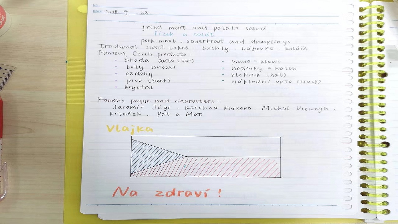 Затем иностранный преподаватель Павлина познакомила студентов с Чешской Республикой. Она представила ее как красивую страну с прекрасными природными пейзажами, интересной культурой и хорошими людьми, рассказала о географическом положении, политической системе, административном делении, обычаях, выдающихся личностях. В соответствии с основными требованиями по специальности студенты, изучающие чешский язык, должны знать и литературу, историю, политику, экономику, внешнюю политику, социальную культуру. В конце иностранный специалист передала привет от Генерального консульства Чешской Республики в Шанхае и Карлова университета, вручила сувенирные канцелярские принадлежности с надписью «UniverzitaKarlova» (Карлов университет) и альбомы с видами Чехии, подаренные Генеральным консульством.