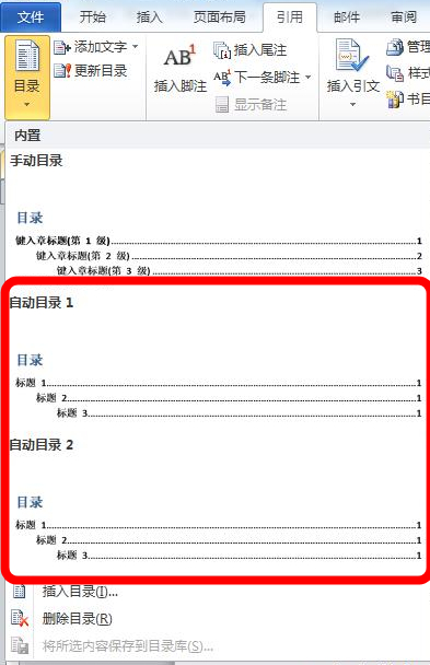 3.在“引用”选项卡中,找到“目录”区域,点击“目录”下拉列表中的“自动目录1”“自动目录2”Word会根据应用的标题样式自动生成一个目录。