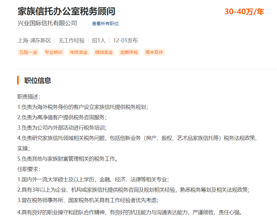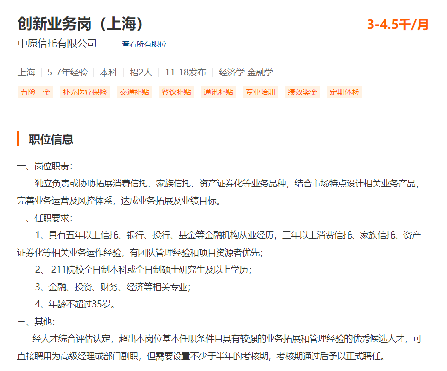 以两家信托公司招聘要求为例,信托业对从业人员的学历、毕业院校、工作经历都有较高要求:本硕博学历,211以上院校,多年金融从业经历等等。