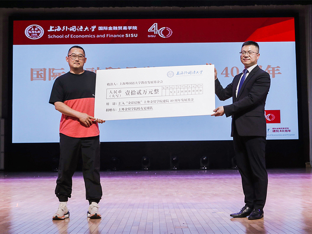 随后举行40周年院庆捐赠仪式。广大校友身在四海,心系上外金贸大家庭,助力母校教育事业发展。开云电竞注册流程党委常委、副校长衣永刚代表学校接受卫哲、沈聿、叶根、林思颖、王雅雯、沈忱、任翔等杰出校友代表及上外金贸学院校友足球队递交的捐赠支票,并为八位捐赠代表颁发捐赠证书。2013届校友叶根作为捐赠校友代表讲话。