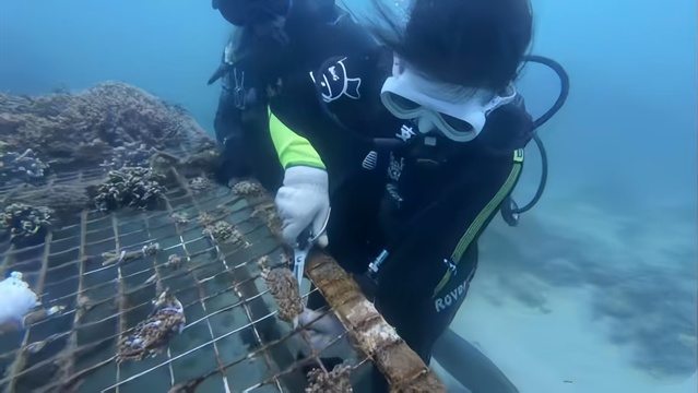 修复不止于规模,更重在创新。蜈支洲岛旅游区海洋部工作人员巴金龙介绍,团队探索出火山石支架修复、绳子式珊瑚苗圃等一系列新技术。例如,火山石支架可将珊瑚抬升至距海底60公分以上,有效避免沙石掩埋淤积;“绳子式珊瑚苗圃”则通过悬浮方式,提升珊瑚覆盖效率。