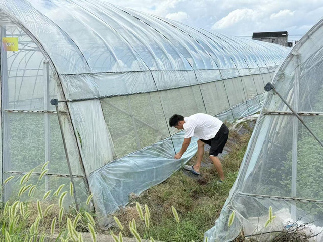 我踩着泥泞的田埂,看到村民们正争分夺秒地进行着两项关键工作:抢收成熟的果蔬、加固农业设施。在大棚间,村民们熟练地捆绑压膜线,用力绷紧棚膜,每一个动作都透着常年积累的经验。“这批番茄再晒两天太阳会更甜,但台风不等人啊。”一位正在抢收的农户抹了把汗,手下采摘的动作却丝毫未停。他朴实的话语里,透着对作物的珍惜与对自然的敬畏。抢收加固大棚的各环节衔接有序,仿佛在进行一场与时间的赛跑。