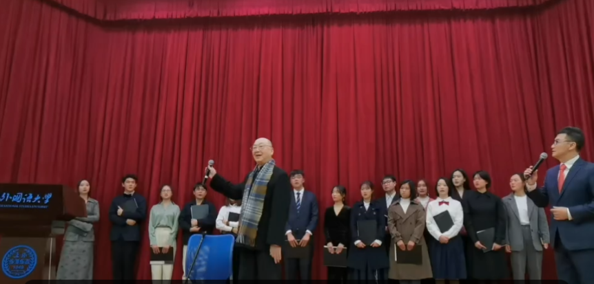 表演结束,新闻传播学院院长郭可、英语学院院长王欣、高级翻译学院院长张爱玲为首期工作坊学员颁发结业证书。随后,王东老师盛情邀请上外的学子们加入工作坊新一期活动。