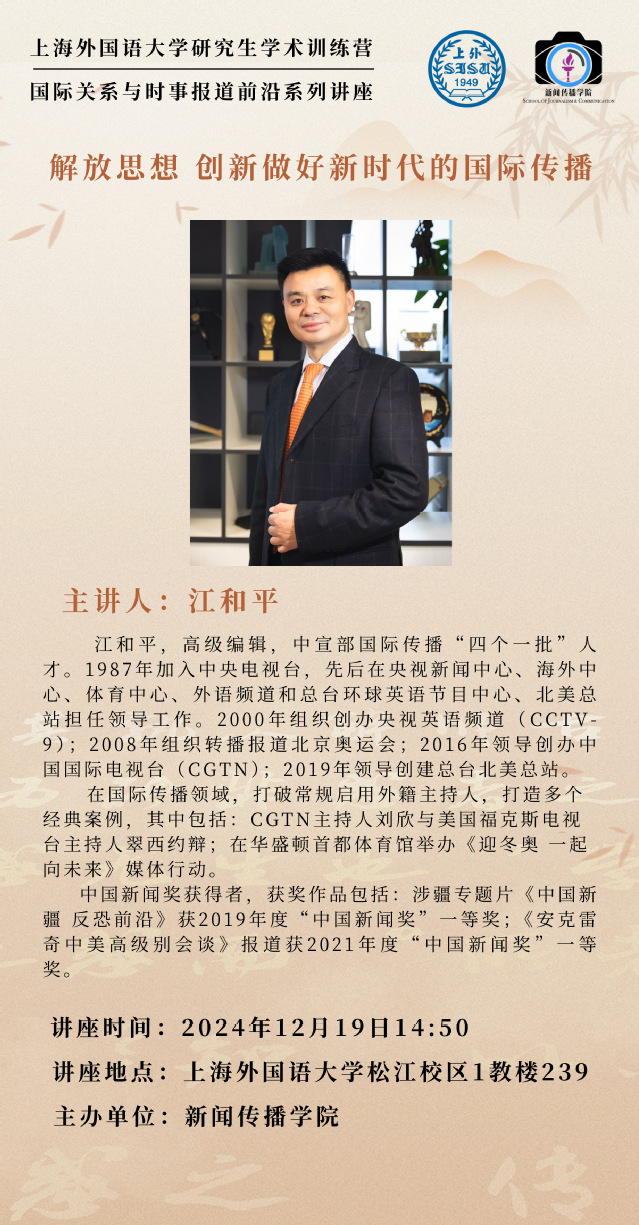 江和平,高级编辑,中宣部国际传播“四个一批”人才。1987年加入中央电视台,先后在央视新闻中心、海外中心、体育中心、外语频道和总台环球英语节目中心、北美总站担任领导工作。2000年组织创办央视英语频道(CCTV-9);2008年组织转播报道北京奥运会;2016年领导创办中国国际电视台(CGTN);2019年领导创建总台北美总站。