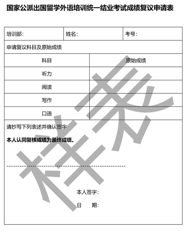 国家公派出国留学外语培训结业统一考试成绩复议 为保证考试的严肃性和考试结果的公平性、公正性并保障学员的利益,特制定《关于国家公派出国留学外语培训结业统一考试成绩复议的规定》。 1、考试成绩公布后5个工作日之内接受学员复议申请。 2、每位学员只能提出一次复议申请。 3、复议流程: 1)学员填写“复议成绩申请表”提交给所在培训部(点击下载PDF文件并打印 2)培训部审核学员申请表并加盖公章后,以传真或扫描件形式发给阅卷单位; 3)阅卷单位选派老师复核成绩; 4)口语成绩复核流程:学员提出口语成绩复议申请后,所在培训部组织教师根据口语考试音频/视频进行复核,并决定是否更改成绩;如保留原有成绩,则需以书面形式(传真或扫描件)告知阅卷单位,由阅卷单位统一出具复议说明;如对原始口语成绩有变动,需将口试音频/视频及说明发给阅卷单位,由阅卷单位再次复议,此复议成绩为最终成绩; 5)阅卷单位应在复议结果中对学员所申请复议项目的成绩提供书面说明,包括对口语或写作水平的点评; 6)阅卷单位需在10个工作日之内将复议结果告知学员所在培训部。 4、复议收费标准:单科复议100元,全科复议400元。 5、复议只适用于英语统考。 本规定经教育部直属出国留学人员培训部教学指导委员会通过,于2018年6月开始执行。