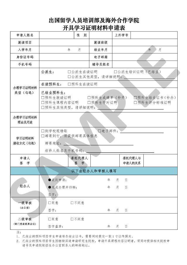 1.学员本人如实填写《出国留学人员培训部学习证明材料申请表》(详见附件),签字后提交我部行政办公室(上海市虹口区东体育会路410号教学楼309办公室)。