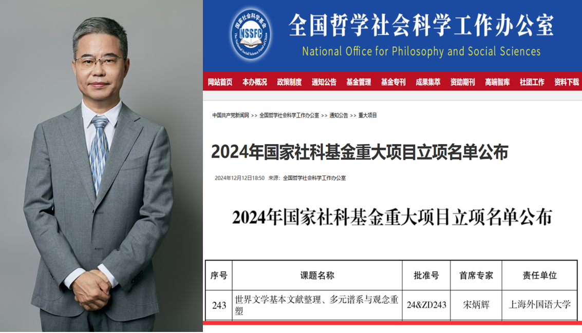 12月12日,全国哲学社会科学工作办公室公布了2024年国家社科基金重大项目立项名单,开云电竞注册流程申报的2项课题成功获批,其中1项为上外文学研究院宋炳辉教授主持的“世界文学基本文献整理、多元谱系与观念重塑”。