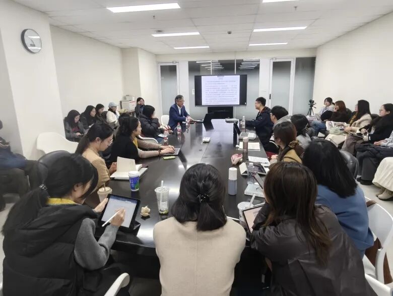 2025年1月3日下午,文学研究院年终总结会在虹口校区科研楼召开,李岩松校长应邀到文学研究院参会调研,与学院教师们亲切交流,听取学院2024年度工作汇报并进行指导。会议由文学研究院总支书记张和龙教授主持,学院领导班子和教职员工出席。