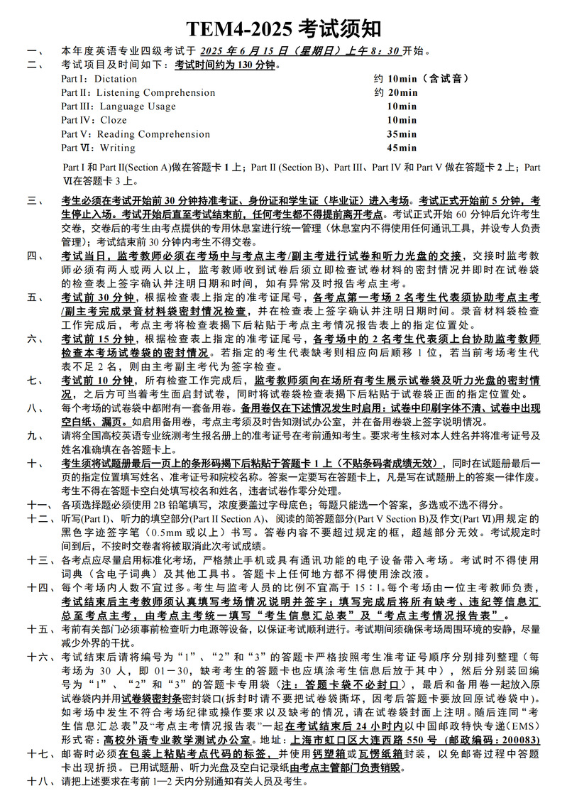2025年英语专业四级考试将于2025年6月15日上午在松江校区举行,特别强调以下几点注意事项,请考生们重视并认真做好准备,以免影响考试: