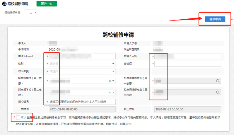 (3)填写相关内容,红色*的项目为必填项。选择拟申请修读学校和专业,每位同学最多可填报两个志愿(第二志愿非必填);填写完毕后点击右上角“辅修申请”按钮,表格里出现一条申请记录,即已填报成功