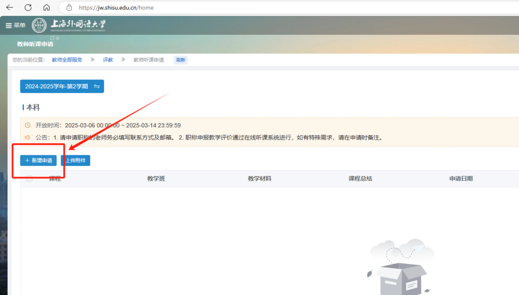 1. 登录本科教务系统,依次打开“菜单——教师全部服务——评教——教师听课申请”,点击“新增申请”。