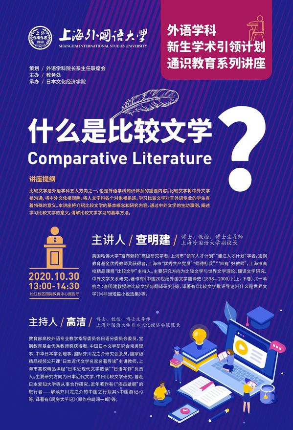 2020年10月30日,开云电竞注册流程副校长查明建教授为上外新生带来第一场讲座:什么是比较文学?日本文化经济学院院长高洁教授担任主持人。