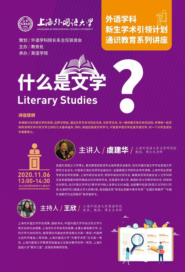 为实现我校“会语言、通国家、精领域”的人才培养目标,帮助外语学科新生从一开始就对本学科的知识体系和研究领域有所了解,学校特邀请资深学者举办“外语学科新生学术引领计划”通识教育系列讲座,均以“什么是……?”为题,由各院系轮流承办,以展现外语学科的人文魅力,引领同学们进入外语学科的精彩世界。