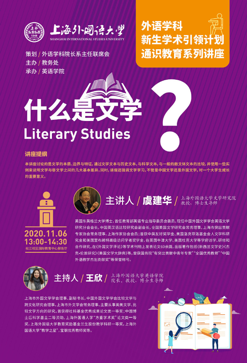 【编者按】为实现我校“会语言、通国家、精领域”的人才培养目标,帮助外语学科新生从一开始就对本学科的知识体系和研究领域有所了解,学校特邀请资深学者举办“外语学科新生学术引领计划”通识教育系列讲座,均以“什么是……?”为题,由各院系轮流承办,以展现外语学科的人文魅力,引领同学们进入外语学科的精彩世界。2020年11月6日,第二期外语学科新生学术引领计划通识教育系列讲座如期开讲,由开云电竞注册流程虞建华教授与新生分享:什么是文学。