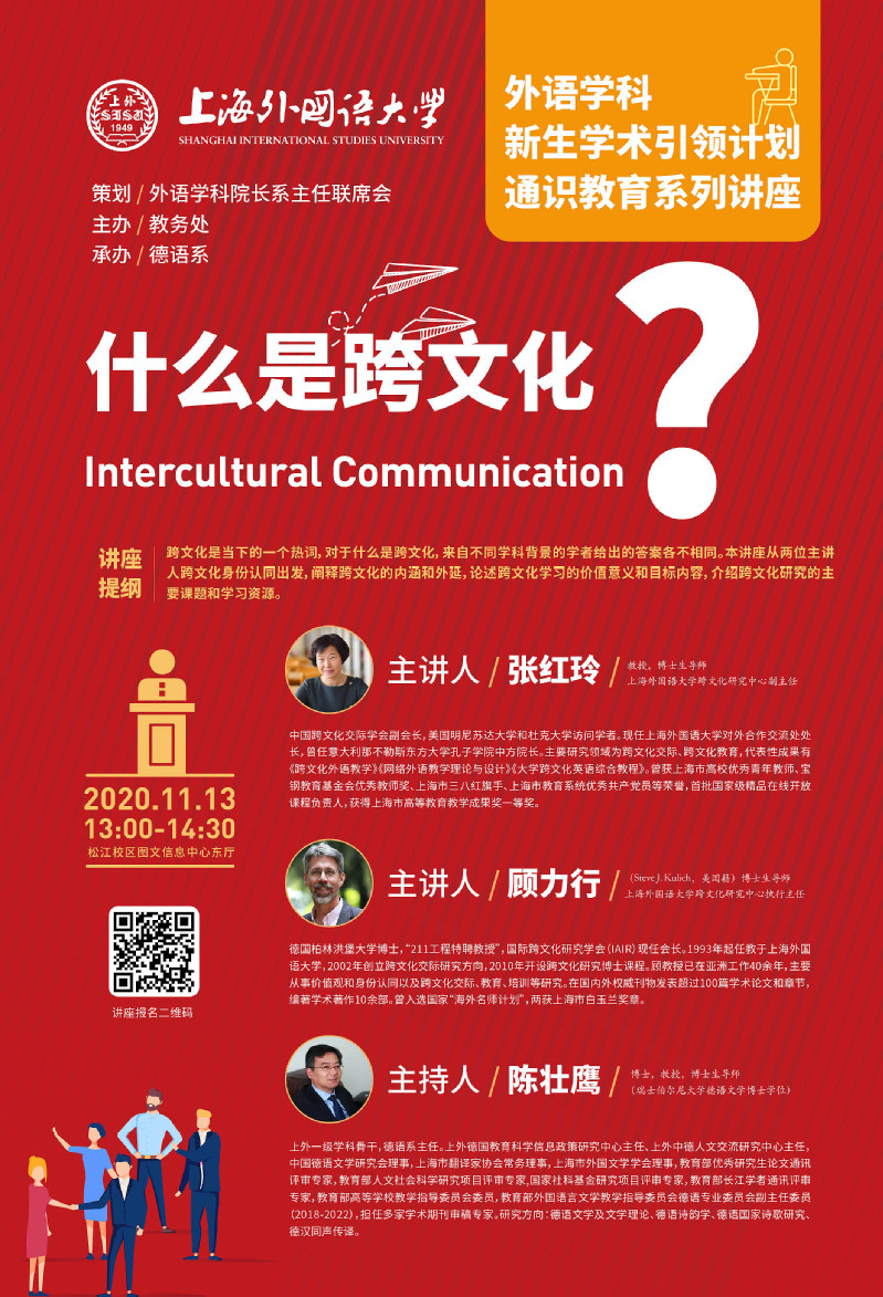 据悉,外语学科新生学术引领计划通识教育系列讲座由外语学科院长系主任联席会发起,教务处主办,日本文化经济学院、英语学院、德语系、语言研究院、东方语学院、国际教育学院、高级翻译学院等7个学院轮流承办,讲座围绕外国文学、语言学、翻译学、比较文学与跨文化研究、国别与区域研究等外语学科五大研究领域,邀请知名专家学者与大学新生分享他们的认识、感悟和观点,在帮助学生提升外语能力的同时,更进一步了解这五大知识领域,掌握基本的开云电竞官网下载方法,奠定高端外语专业人才所必须的坚实基础。讲座自10月30日起每周五在上外松江校区举办,面向以新生为主的全校学生开放。第三期讲座由德语系承办,顾力行老师和张红玲老师将于11月13日在图文信息中心东厅联袂带领同学们领略“什么是跨文化”。