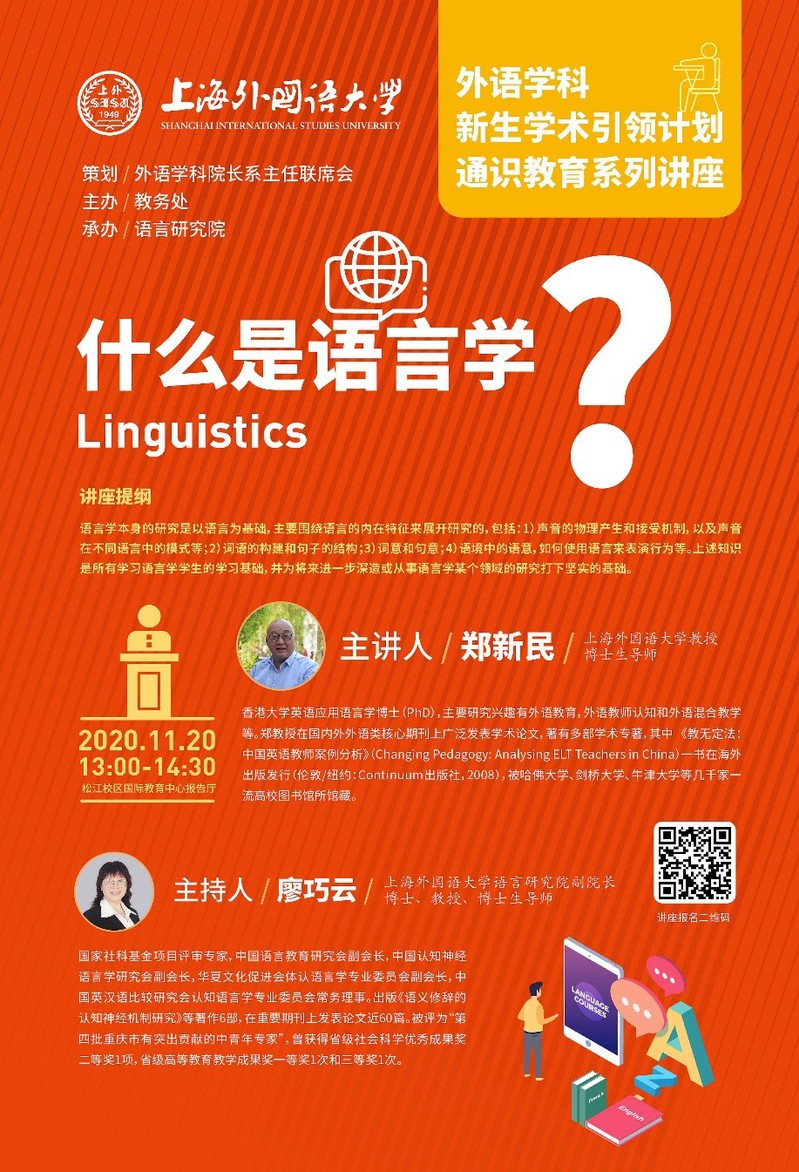 【编者按】为积极推进“多语种+”办学战略,突出“会语言、通国家、精领域”,帮助外语学科新生从一开始就了解本学科的知识体系和研究领域,提升外语能力,掌握基本的开云电竞官网下载方法,学校特邀资深学者举办“外语学科新生学术引领计划”通识教育系列讲座。2020年11月20日,第四期外语学科新生学术引领计划通识教育系列讲座在上外松江校区成功举办,国际教育学院郑新民教授为大家分享:什么是语言学。讲座由语言研究院副院长廖巧云主持。