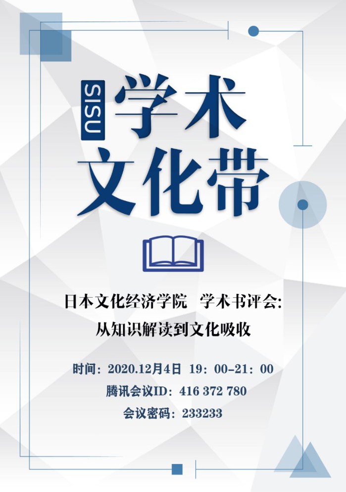 SISU云端学术角第十七期活动由教务处主办、日本文化经济学院承办,以“学术书评会:从知识解读到文化吸收”为主题,将于12月4日(周五)19:00准时开启,欢迎大家积极参与!